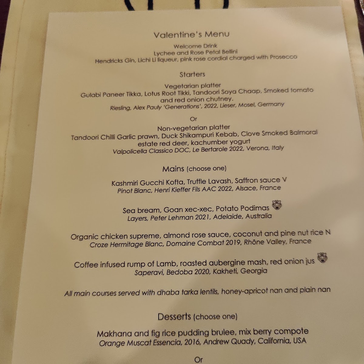 Spiced apricot and fig crumble, stem ginger and honey kulfi, raspberry sorbet, chocolate gelato, praline dust, mixed berry compote 3.00 with a glass of Orange Muscat Essencia 19.95 with a bottle of Orange Muscat Essencia Dessert wines glass 50ml Dessert wines bottles 375ml